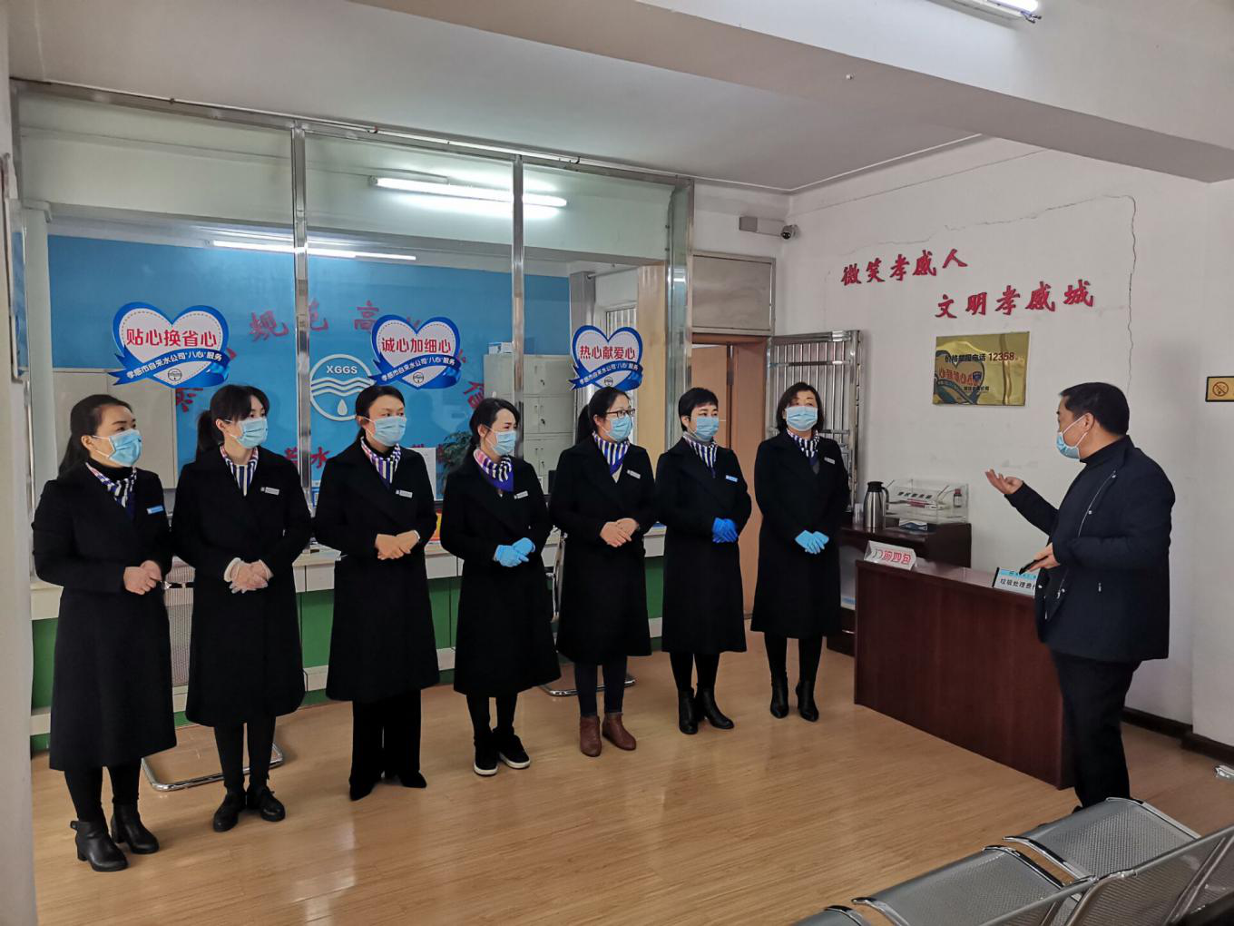 當(dāng)天上午8:00左右,公司所轄的玉泉路、市民之家、城站路三個(gè)客服營(yíng)業(yè)網(wǎng)點(diǎn),早早開門受理業(yè)務(wù)。大廳接待場(chǎng)所全面消殺、門口臨時(shí)增放候位板凳、布置安全防護(hù)設(shè)施等等。窗口人員按照要求配帶口罩,久違的微笑、貼心的問候如沐春風(fēng)。