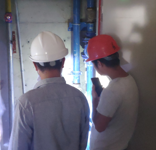 驗收小組依次巡查了用水閘閥,入戶水表,供水管道,供水井蓋,二供泵房、樓頂水箱等供水設施,施工方全程參與。本次驗收中發現4處管道井安裝不合格,部分管道油漆標識不清晰,入戶水表前后管徑不一致、二供泵房未做防鼠設施等問題,當即要求施工方整改。
